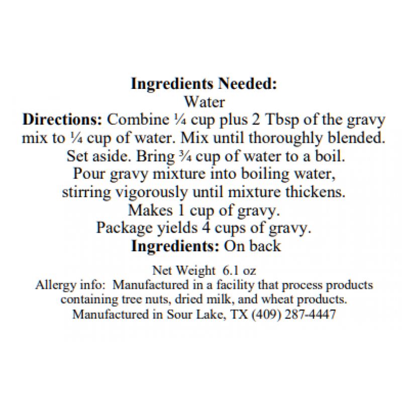 A southern favorite. Great with chicken tenders, biscuits, andchicken fried steak. Add water. Makes 4 cups of gravy.
