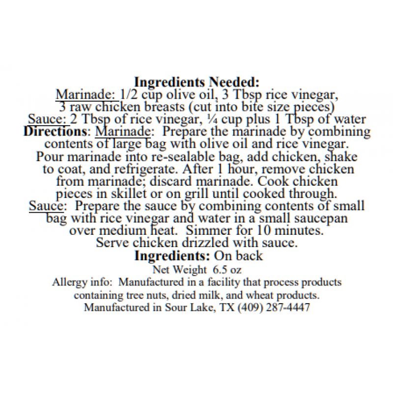 Kick up the flavor with this delicious chicken! Serve with a side order of our Stir Fryand Fried Rice and you have a complete meal! Add chicken, rice vinegar, and olive oil.