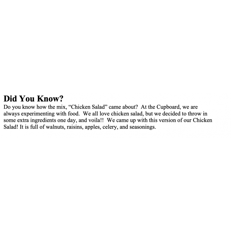Take a moment to enjoy this lunchtime favorite! We put a new twist to this chicken salad by adding walnuts, raisins, and apples! You add yogurt, mayonnaise and chicken to make 4 cups.