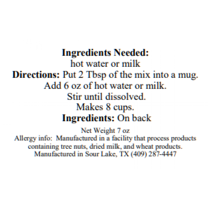 Great new, rich flavor. 2 tbsp. per cup of hot water or milk. Makes 8 cups.
